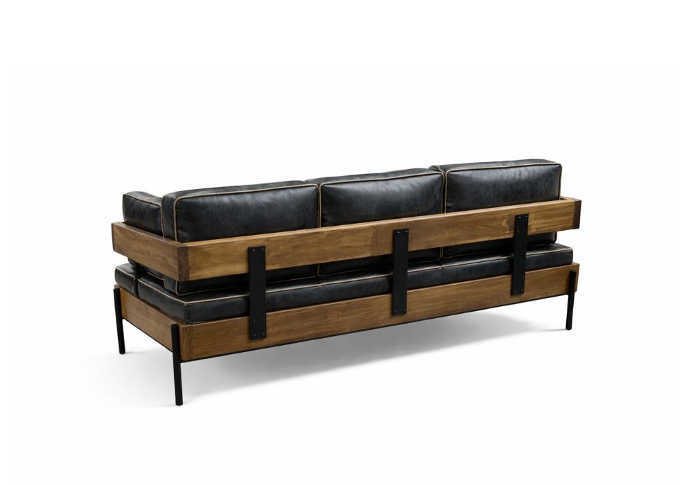 THE DYNA SOFA’S frame is constructed from solid wood panels with a RUSTIC OAK FINISH, wrapping around the back and sides of the sofa. These wooden panels are reinforced with vertical black metal brackets, adding both structural support and an industrial aesthetic. The sofa stands on slim black metal legs, which elevate it slightly off the ground and contribute to its modern profile